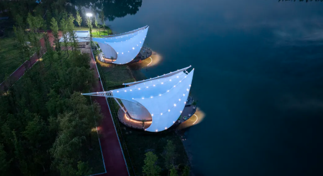 在圩美磨滩萌鸟营地中设计师善于运用轻盈膜结构来诠释“童心”,客房、办公区、桥等场所都能看到膜结构元素,透光通风的膜结构材质捕捉着大自然的光线与微风,营造出温馨而自然的氛围。