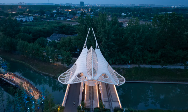 圩美磨滩位于合肥大圩农业区,这里有一处独特的露营服务区,建筑与自然景观完美融合,营造出充满童趣的空间场景。设计师巧妙运用鸟、虫、螺等自然动物仿生的设计语言,通过现代建筑空间和技术将建筑隐匿于绿林之中,展现出别具一格的美感。