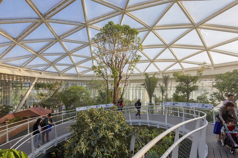 温室的屋顶如绽放的花朵般优雅舒展。其独特的造型不仅美观,还通过采用四氟乙烯(ETFE,一种高透光性轻质材料)助力实现可持续发展目标。对于需要阳光的植物物种而言,ETFE 是植物园外立面的理想材料选择。