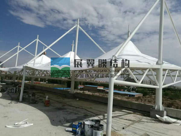 宁夏中宁第六中学膜结构主席台工程近日正在施工,工程现已完成材料加工、油漆、焊接、吊装、膜材覆盖等工作,接下来进行结构附件紧固及膜材拉伸除皱工作,以下为现场施工图片: