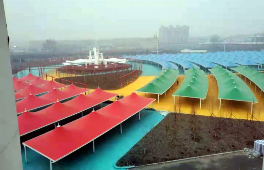 黑龙江铁力经开区集市大棚膜结构工程近日完工,大棚设计为尖顶张拉结构,采用白、红、黄、蓝、绿五色膜材,一排排一列列遍布于广场之上,显得十分壮观。