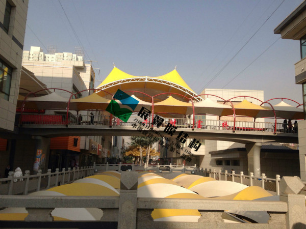 兰州金牛街膜结构工程全系列包括膜结构天井、膜结构屋顶遮阳棚、膜结构天桥通道遮阳棚、啤酒屋膜结构屋顶、特殊膜材玻璃房等等、工程全部采用彩色膜材搭配建造,造型设计别出心裁。这些张拉膜建筑不但具备强大的实用功能,同时也成为了商业街一大观赏亮点。