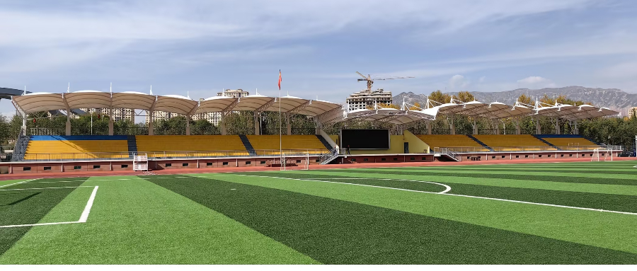 青海省海东市第三中学运动场看台膜结构工程,工程体量包含看台及主席台的雨棚安装,整体造型美观,结构稳固,视野无遮挡,大大提升了校园环境。